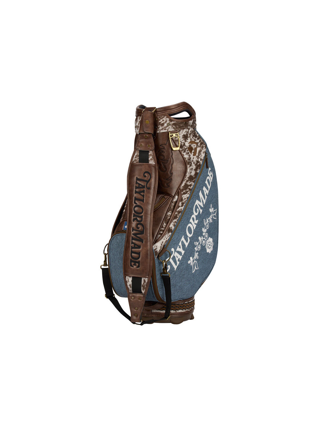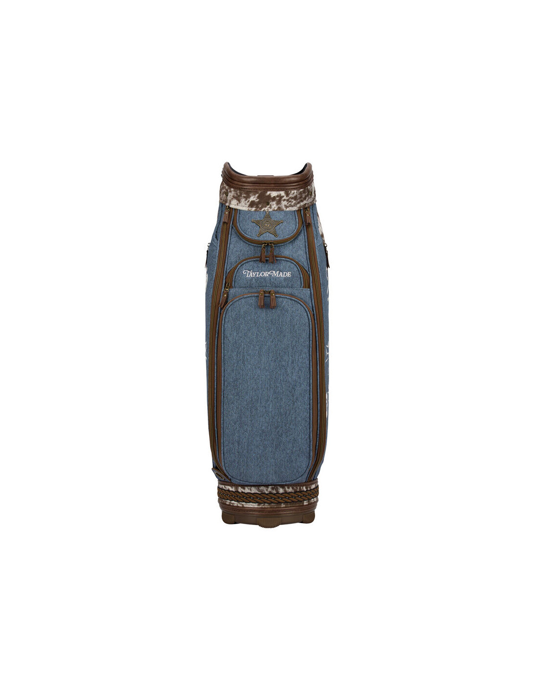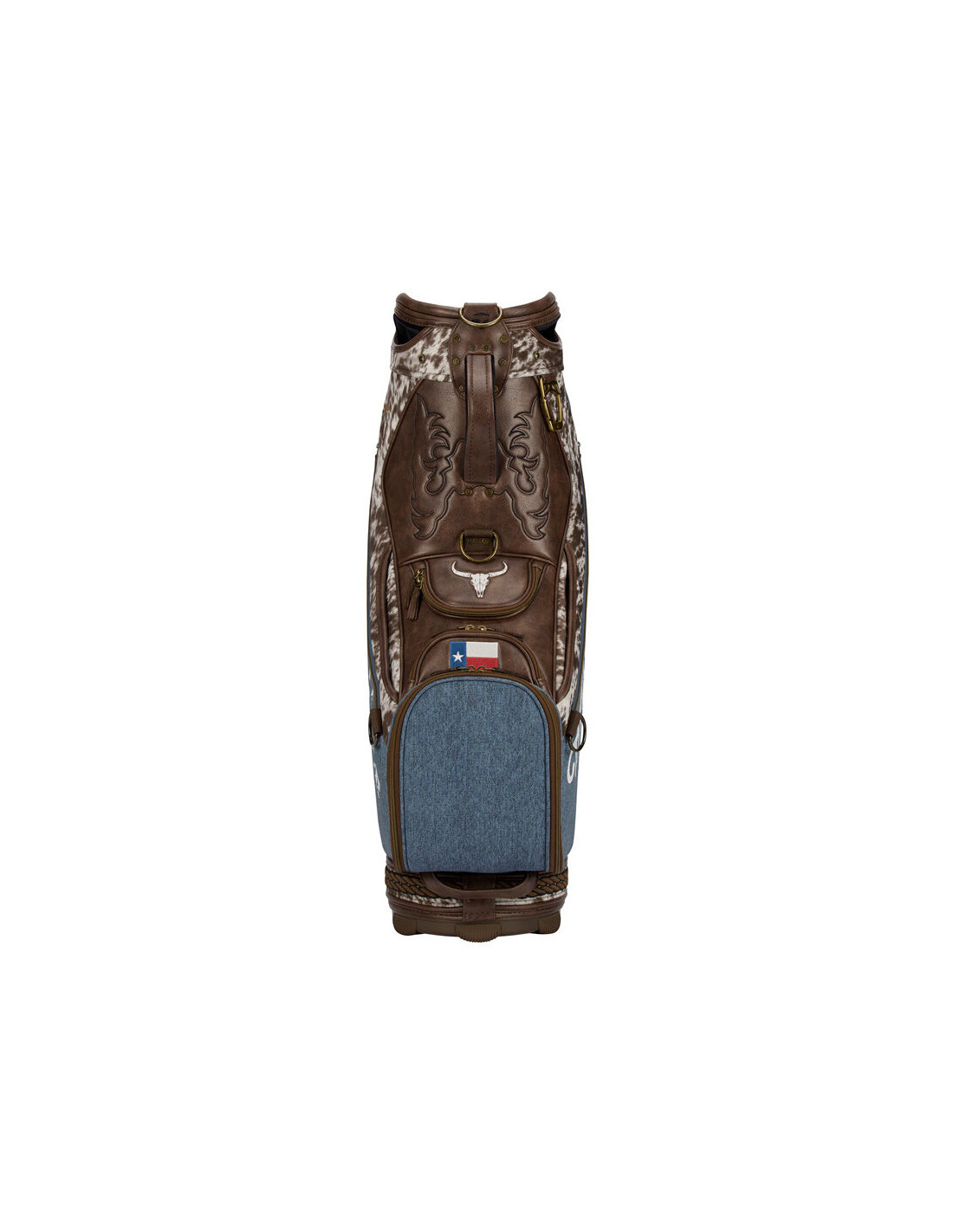 Look closer and the craftsmanship speaks for itself. A sheriff's badge on the valuables pocket pays tribute to the law of the land. A cowhide skull on the back of the bag nods to the livestock show that put Houston on the map. A rope detail wraps the base of the bag — a subtle but unmistakable salute to rodeo culture. The TaylorMade script is rendered in 3D raised chain stitch across both side panels, bold and proud, just like the state it represents.