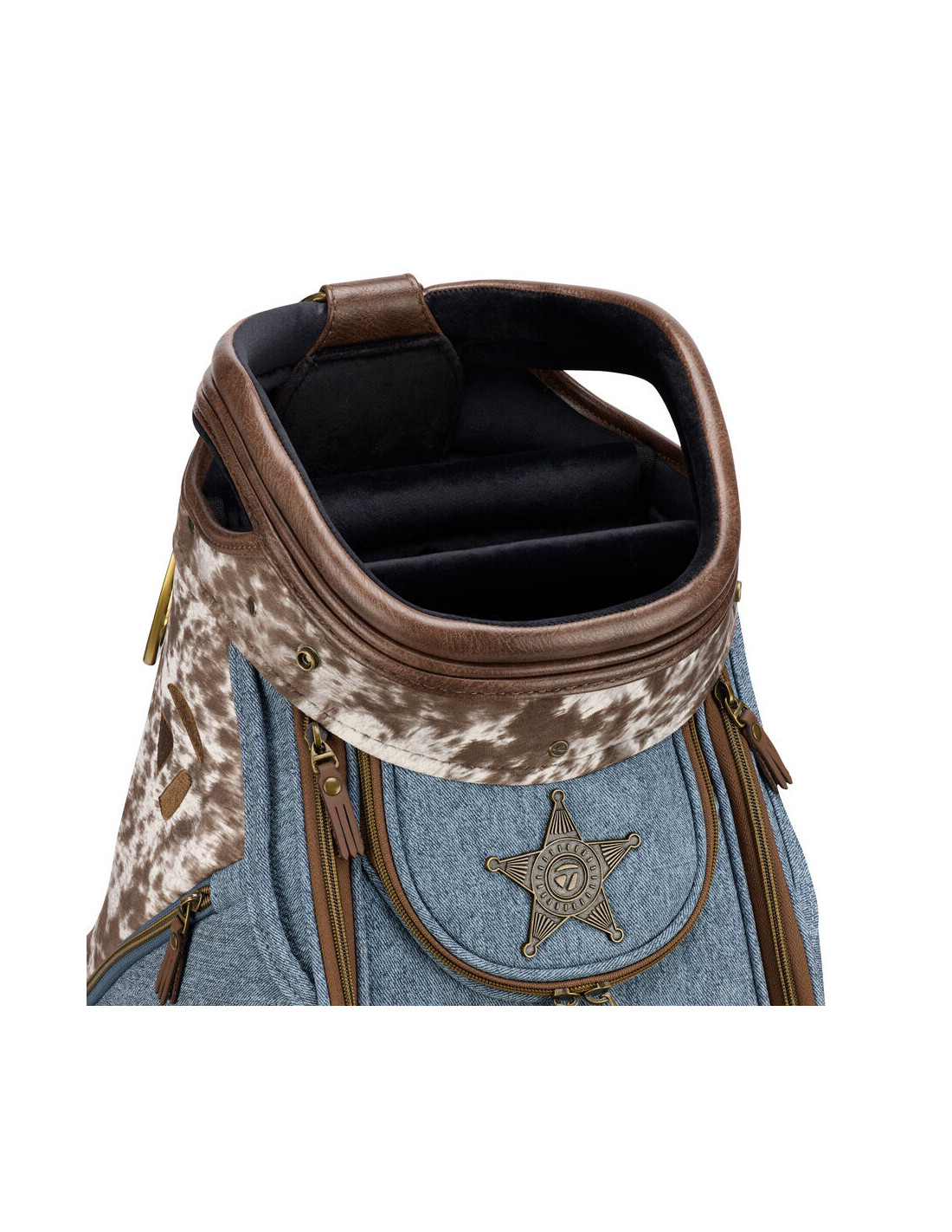 Observe con atención y la artesanía se aprecia por sí misma. Una placa de sheriff en el bolsillo para objetos de valor rinde homenaje a la ley. Una calavera de piel de vaca en la parte posterior del bolso hace referencia a la feria ganadera que catapultó a Houston a la fama. Un detalle de cuerda envuelve la base del bolso, un sutil pero inconfundible homenaje a la cultura del rodeo. El logotipo de TaylorMade está bordado en relieve 3D a lo largo de ambos paneles laterales, con un estilo audaz y orgulloso, al igual que el estado que representa.