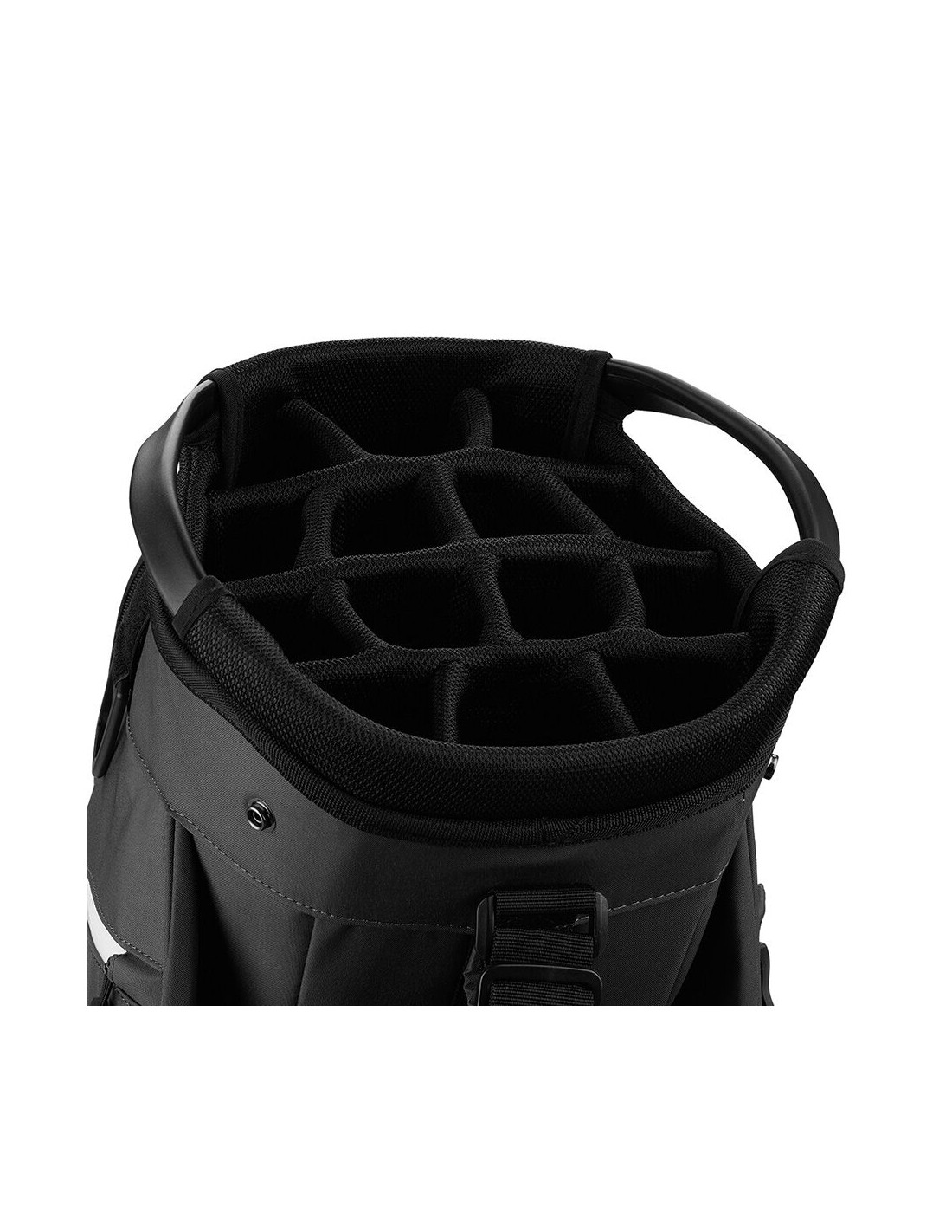 La correa de paso para carrito le permite asegurar fácilmente su bolso al carrito de golf. Si prefiere caminar, una base habilitada para carritos de empuje facilita el transporte de su bolso por el campo.