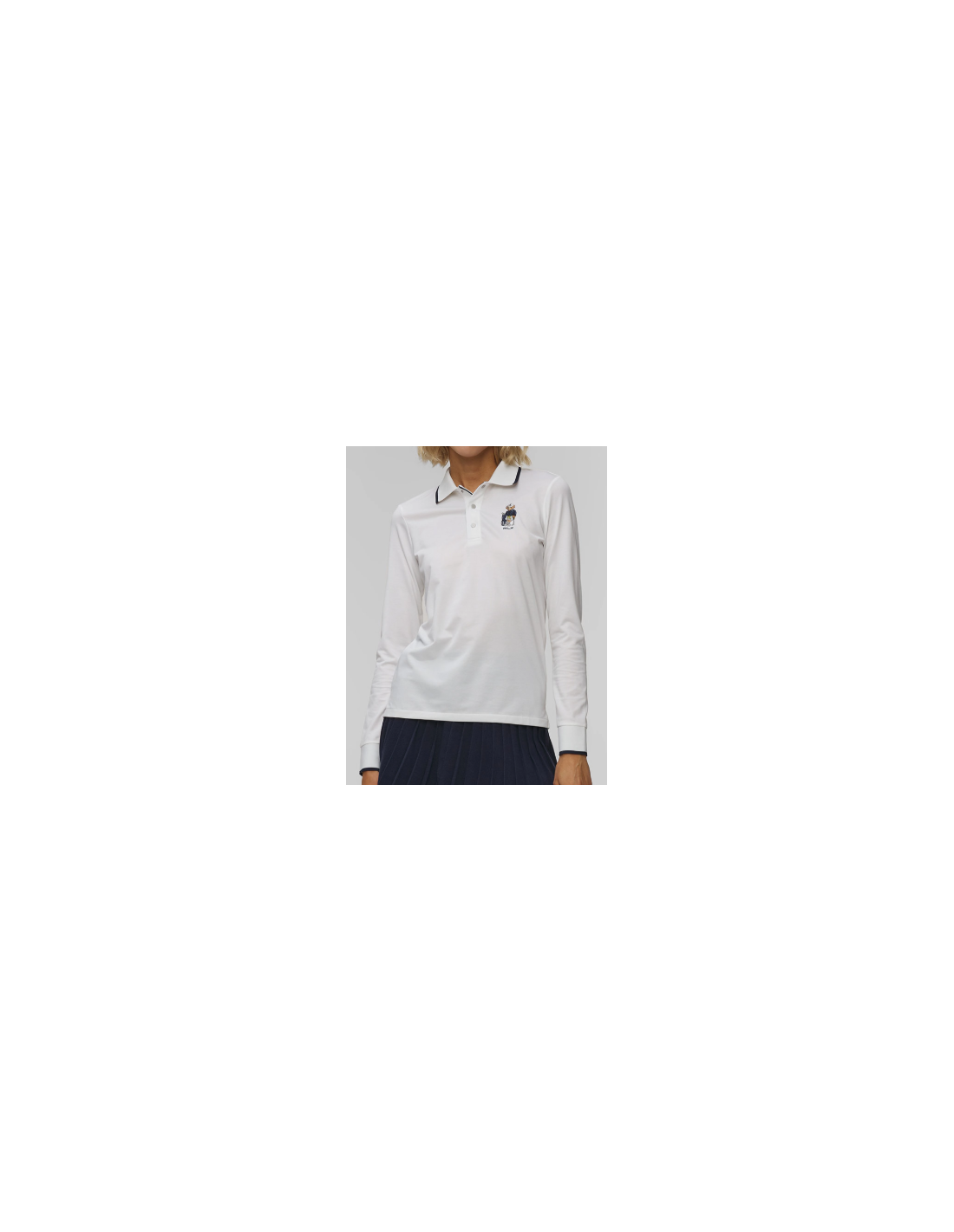 El polo blanco de manga larga Ralph Lauren RLX para mujer combina un diseño elegante y entallado con funcionalidad deportiva, perfecto para días activos.
