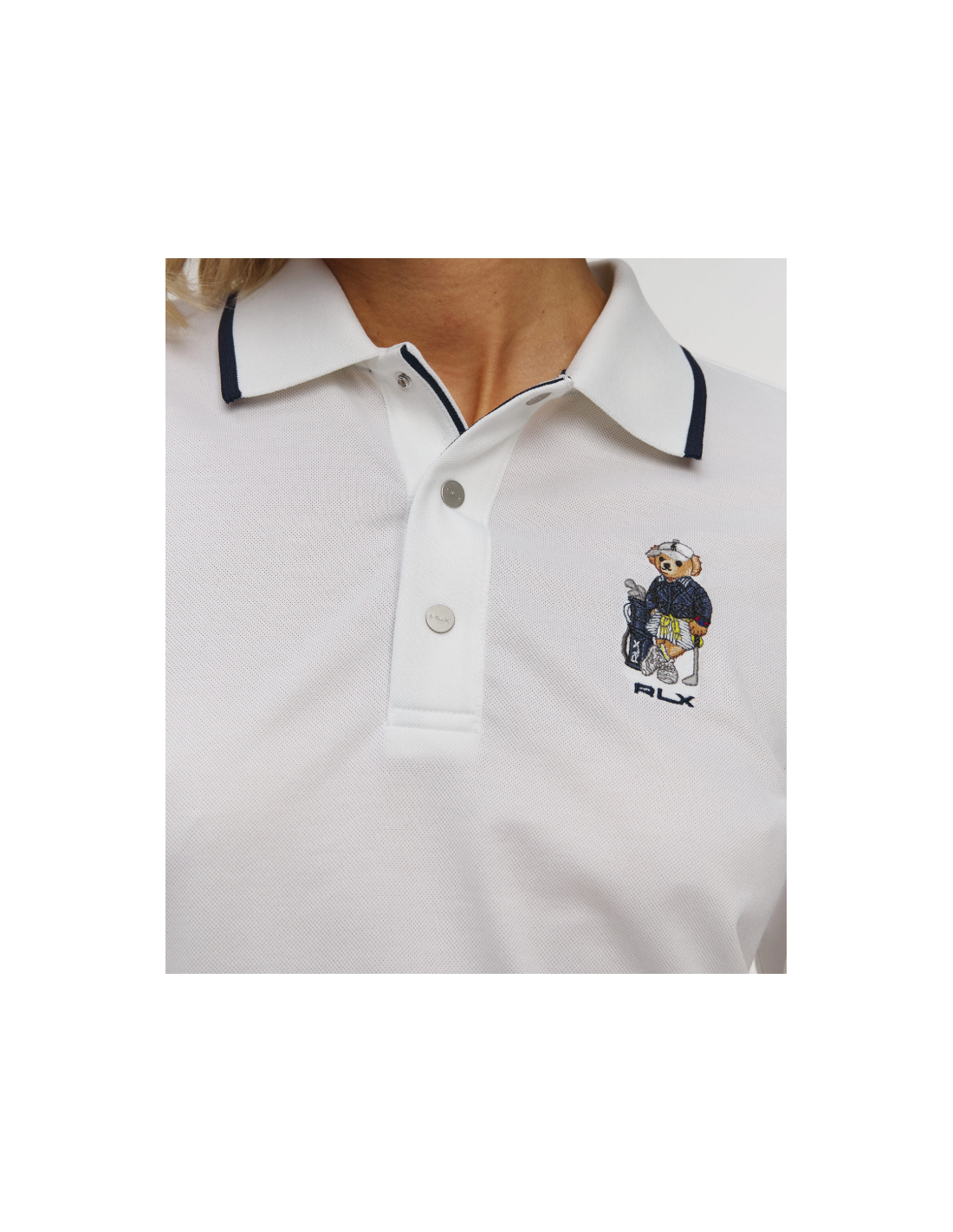 - Cuello de polo acanalado: un cuello estructurado con tres broches metálicos RLX le da un toque clásico.